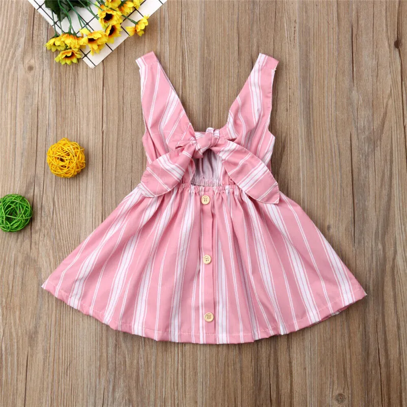 استعارات ل الاطفال الطفل بنات مخطط اللباس 6M-4Y الصيف الشاطئ نمط أكمام القوس عقدة الجوف خارج فستان الشمس فتاة Strappy و زر القطن اللباس